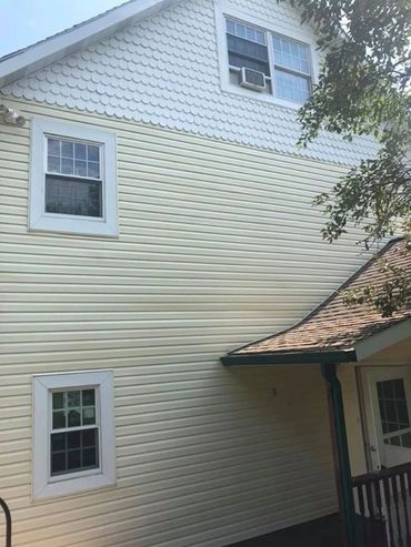 The last step of our pressure washing system is to rinse the chemicals. Although you can see improvement before this rinse, the end result is nothing short of stunning. All the dirt and grime is gone, leaving behind sparkling clean siding that looks brand new!